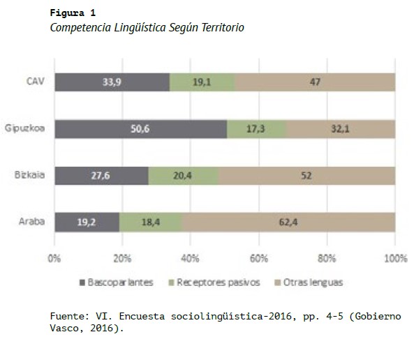 Tal y como se puede observar, según los datos de la última encuesta sociolingüística llevada a cabo por el Gobierno Vasco (2016) el 33,9% de la población de la CAV habla euskera y el 19,1% es receptor pasivo de esta lengua.