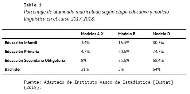 El alumnado actual de esta asignatura, ha cursado estudios preuniversitarios en un modelo educativo bilingüe. Tal como explica Cenoz (2009), el euskera ya se empleaba en el ámbito educativo antes de la Ley de la Normalización del Euskera aprobada en el año 1982, pero dicha ley definió los modelos bilingües de educación en la CAV. El Decreto de Bilingüismo 138/1983 (Boletín Oficial del País Vasco [BOPV] 108/19-7-1983) estableció tres modelos para la escolarización: A, B y D (no existe la letra C en euskera); aunque también existe el modelo X, en el que no hay presencia del euskera. La Tabla 1 muestra las cifras del alumnado matriculado en enseñanzas de régimen general no universitarias en la CAV por territorio histórico y nivel de enseñanza, según titularidad del centro y modelo lingüístico en el curso 2018-2019. Como puede verse en la Tabla 1, el modelo D, con un 75% de las materias en euskera y un 25% en castellano y lengua extranjera (normalmente, inglés), es el que se imparte mayoritariamente.
