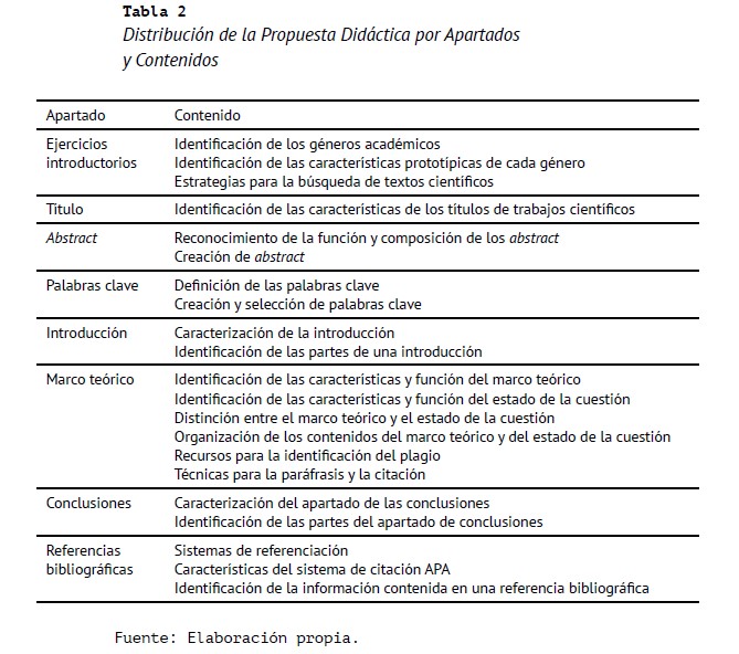 Tal como se ha mencionado, es necesario ser consciente, en primera instancia, de las necesidades comunicativas que van a tener los estudiantes. Cuando estos ingresan en la universidad, se ven expuestos a gestionar y crear textos de corte académico, desde monografías hasta trabajos de fin de grado. Así, en vista de los géneros discursivos a los que con mayor frecuencia van a estar expuestos los estudiantes a lo largo de su formación (Gardner & Nesi, 2013), esta propuesta toma como base el género artículo científico. Se trata este de un género con el que van a estar familiarizados desde sus primeros días en el mundo académico y que, por extensión, será identificable por parte de los estudiantes (Alexopoulou, 2010).