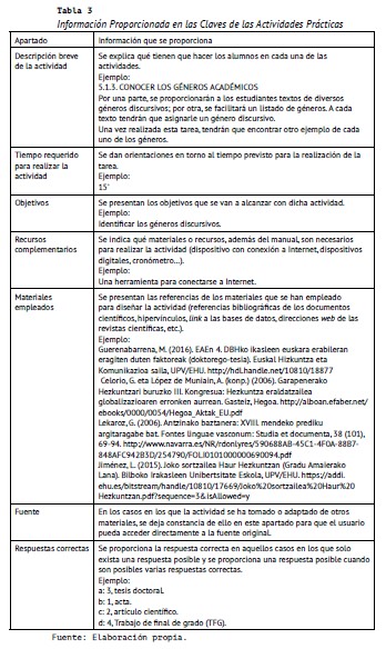 En la segunda parte de este manual se dan las claves o soluciones de las actividades prácticas. Estas sirven para el trabajo autónomo y como guía para el profesorado. La información sobre las claves se presenta clasificada en los siguientes apartados: descripción breve de la actividad, el tiempo requerido para realizar la actividad, los objetivos de la actividad, los recursos complementarios necesarios, materiales empleados, fuente y respuestas correctas. En la Tabla 3, se describen de manera pormenorizada los contenidos de cada apartado.