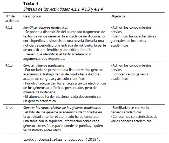 Esta secuencia de actividades favorece que el estudiante identifique que la escritura que se produce en el ámbito académico tiene unas particularidades que la distinguen de las prácticas escritoras llevadas a cabo hasta el momento (Carlino, 2013). Así también, van a identificar que los géneros en concreto que se producen en este ámbito tienen unos objetivos determinados y unas características concretas que están determinadas por el contexto social e histórico en el que se producen (Gardner & Nesi, 2013).
