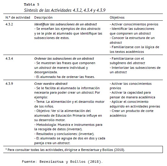 En este trabajo, concretamente, se ha descrito una propuesta para trabajar el género artículo científico con estudiantes de perfil bilingüe (euskera-castellano) que están cursando sus estudios universitarios en euskera. La propuesta, fundamentada en el enfoque basado en los géneros, aborda cada parte del género artículo científico de manera desglosada y con un nivel de dificultad creciente. Asimismo, las actividades van acompañadas de una clave de respuestas que favorecen el aprendizaje autónomo y que buscan ayudar a los docentes en la compleja tarea que supone formar en las habilidades escritas.