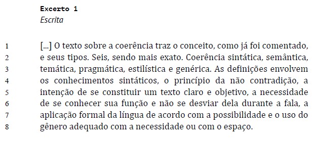 A escrita de Marcos foi decorrente da leitura do texto teórico 1, denominado Coerência Textual: um princípio de interpretabilidade, da autoria de Ingedore Villaça Koch e Vanda Maria Elias. Após esse procedimento, Marcos, assim como seus colegas de turma, teve de escrever um texto acerca das impressões em relação ao texto lido, registrando-as como nota de leitura. O excerto 1, que se segue, representa apenas um trecho do texto de Marcos.
