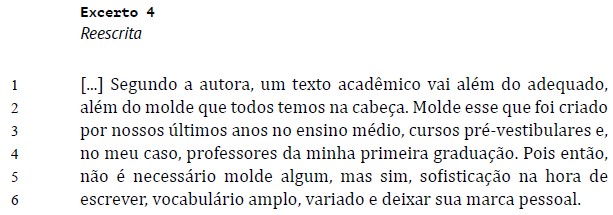 O bilhete orientador teve teor diretivo, na medida em que propôs uma mudança pontual e qualificou a produção da estudante com o elogio intensificado (“gostei muito do seu texto”). Além disso, a mediadora suavizou o teor crítico da orientação, ao mencionar que as reflexões relativas a estilo no texto acadêmico aconteceram, porém essa ação não havia sido suficiente e poderia, assim, ser ampliada na segunda versão. Em atendimento à demanda proposta no bilhete, apresentamos o excerto 4, que representa o trecho acrescentado pela estudante ao excerto 3, com a finalidade de acatar a recomendação da mediadora.