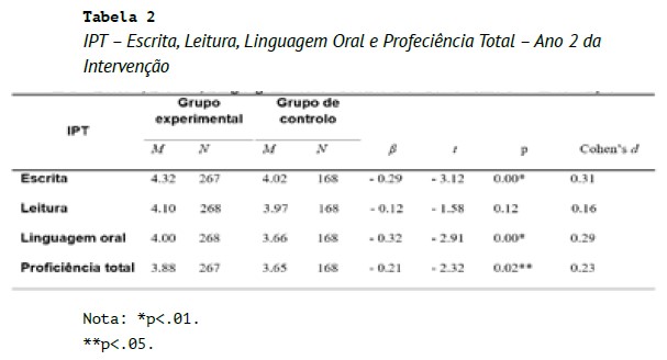 Tendo por base os resultados do IPT, obtidos no final do segundo ano da intervenção (Tabela 2), os alunos do GE apresentaram um melhor desempenho em escrita, leitura, linguagem oral e proficiência total, comparativamente aos alunos do GC.