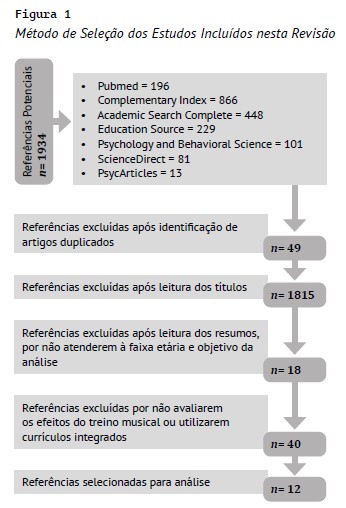 Posteriormente, foram analisados os títulos e/ou resumos desses artigos, tendo sido excluídos: (i) artigos que não avaliavam especificamente os efeitos do treino musical nas suas componentes teórica e/ou instrumental na matemática ou no desempenho académico em geral ou nas funções cognitivas ou na plasticidade cerebral; (ii) estudos com crianças e adolescentes com dificuldades de aprendizagem específica ou condição clínica; (iii) estudos com adultos; (iv) estudos em que foram utilizados currículos integrados; (v) estudos em que não existiu um grupo de controlo. A partir desta seleção inicial, foram selecionados 40 artigos para uma leitura completa. No final, foram selecionados 12 estudos que cumpriam na totalidade os critérios estabelecidos previamente.