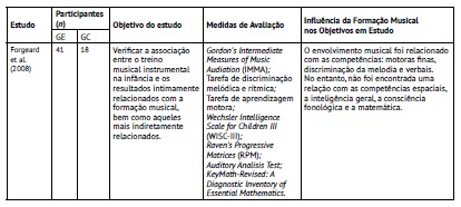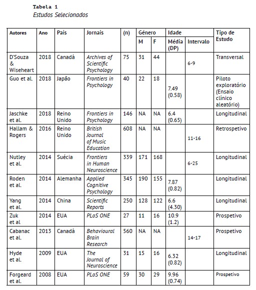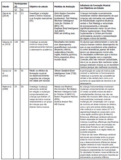 Nos 12 estudos, os resultados obtidos em crianças com formação musical (teórica e/ou instrumental) foram comparados a resultados de crianças sem formação musical (grupos de controlo), emparelhados por várias variáveis. É de salientar a existência de mais artigos no ano de 2014 e o facto de haver um período de 2 anos, entre 2010 e 2012, em que não foram encontrados estudos que se enquadrassem na revisão em análise.
