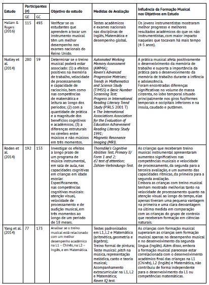 A partir da revisão, verificou-se que quatro dos estudos mencionam uma influência positiva da formação musical (teórica e/ou instrumental) no desempenho académico em geral (Cabanac et al., 2013) ou em disciplinas tais como o Inglês (Yang et al., 2014) e a Matemática (Hallam & Rogers, 2016; Nutley et al., 2014). Contudo, os estudos de Yang et al. (2014) e Forgeard et al. (2008) não confirmam os resultados acima mencionados quanto às competências matemáticas. No estudo de Yang et al. (2014), as crianças que estudaram música superaram os não-músicos só no desempenho musical e no desenvolvimento da língua inglesa. Contudo, e embora o treino musical pareça estar correlacionado com o desenvolvimento académico final das crianças na língua materna (chinês), na língua inglesa e na matemática, isso não contribuiu de forma independente para o desenvolvimento da língua materna ou das competências matemáticas. Também Forgeard et al. (2008) indicaram que as crianças que aprenderam a tocar um instrumento, durante 3 ou mais anos, superaram os seus pares de controlo em áreas estritamente relacionadas com a música – competências motoras finas e discriminação entre melodias –, mas não ao nível das competências fonémicas, espaciais ou da matemática. O grupo de controlo superou também no desempenho verbal (vocabulário) e no raciocínio não-verbal, tendo sido o treino musical apontado como um preditor destas capacidades.