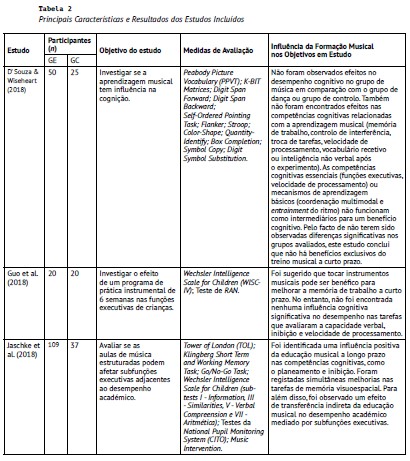 No que diz respeito às funções cognitivas, os resultados obtidos nos estudos de Guo et al. (2018) e D’Souza e Wiseheart (2018) não são unânimes a identificar os benefícios cognitivos do treino musical, nomeadamente no que se refere à velocidade de processamento e à capacidade verbal. No estudo de Guo et al. (2018), os autores, após medirem as funções cognitivas antes e depois da aplicação de um programa de treino musical durante 6 semanas, apenas conseguiram observar uma melhoria na memória de trabalho de crianças entre os 6 e os 8 anos. D’Souza e Wiseheart (2018), para além de não observarem alterações nas competências cognitivas relacionadas com a aprendizagem musical, também não encontraram benefícios na memória de trabalho, ao contrário do que se verificou no estudo de Guo et al. (2018), na troca de tarefas, no controlo de interferência e na inteligência não-verbal. Ao nível do raciocínio, memória de trabalho visuoespacial e verbal, ao longo do tempo, e capacidades musicais e rítmicas, flexibilidade (ex.: fluência verbal), raciocínio verbal e memória a curto prazo, os estudos são coincidentes quanto à influência positiva que a formação musical exerce sobre estas funções (Jaschke et al., 2018; Kaviani et al., 2014; Nutley et al., 2014; Roden et al., 2014; Zuk et al., 2014). No que diz respeito à influência positiva da educação musical, a longo prazo, em competências cognitivas como a inibição, os resultados de Jaschke et al. (2018) contradizem os de Guo et al. (2018) e Zuk et al. (2014), tendo em consideração que em ambos os estudos não foram observados efeitos significativos.