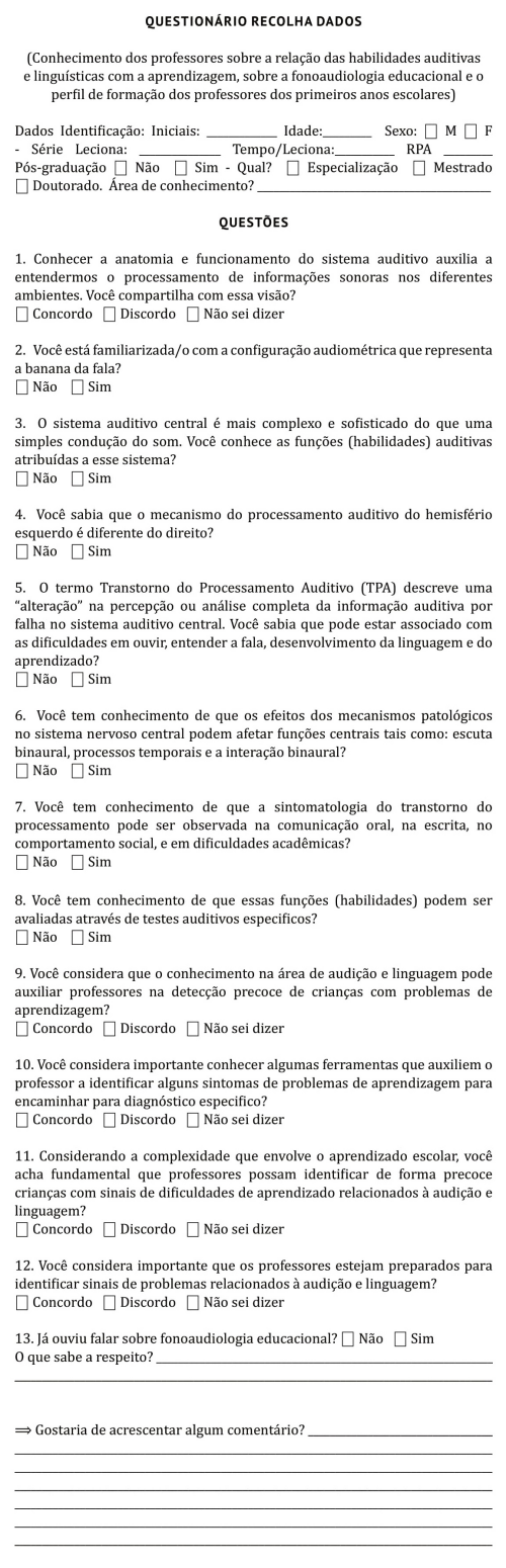 O questionário, composto por 13 questões, foi aplicado durante a formação continuada na Escola de Formação de Educadores do Recife Professor Paulo Freire (EFER) em 2019, com tempo máximo de 20 minutos, onde cada professor respondeu individualmente, devolvendo para análise ao término. Cinco questões (1, 9, 10, 11 e 12) eram de múltipla escolha e sete questões (2, 3, 4, 5, 6, 7, 8) exigiam sim ou não como resposta. Especificamente a questão 13 incluía a possibilidade de o professor se expressar livremente escrevendo o que sabia a respeito da fonoaudiologia educacional. Ainda no questionário, havia local para preenchimento dos dados pessoais, tais como idade, sexo, tempo de docência, tempo de formação.