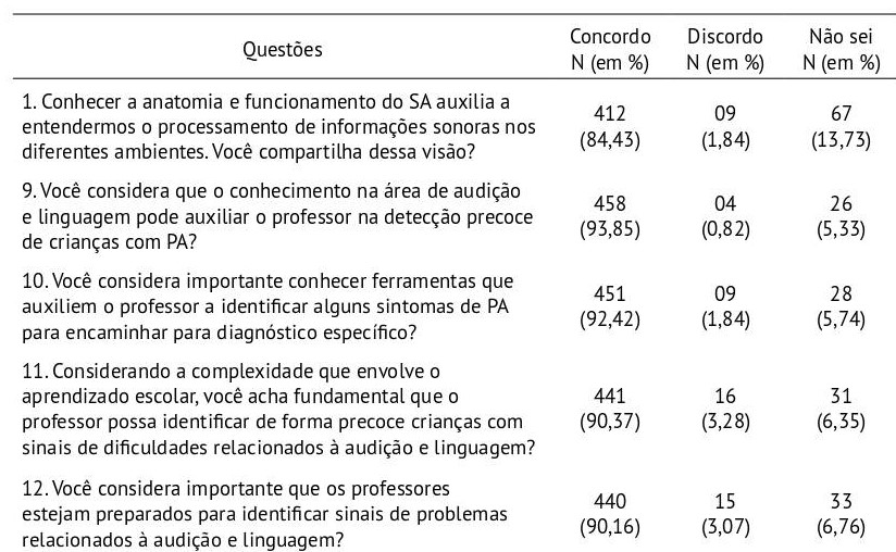 A análise apresentada a seguir refere-se à concordância ou não do professor em relação à questão apresentada, sobre o que ele considera ou não importante no que diz respeito ao papel da audição e linguagem para a aprendizagem (Quadro 1).