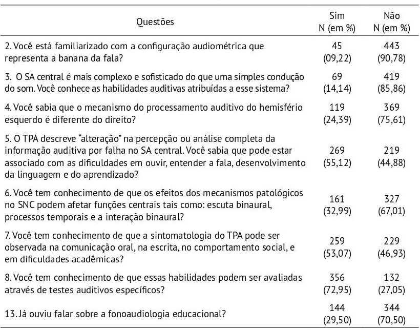 O Quadro 2 ilustra questões específicas e fundamentais para o professor identificar crianças com dificuldades e transtornos de aprendizagem em sala de aula, tais como sistema auditivo, processamento e informação auditiva. Observa-se que a maioria absoluta dos professores consideram importante ter conhecimento sobre habilidades auditivas e linguísticas para o aprendizado.