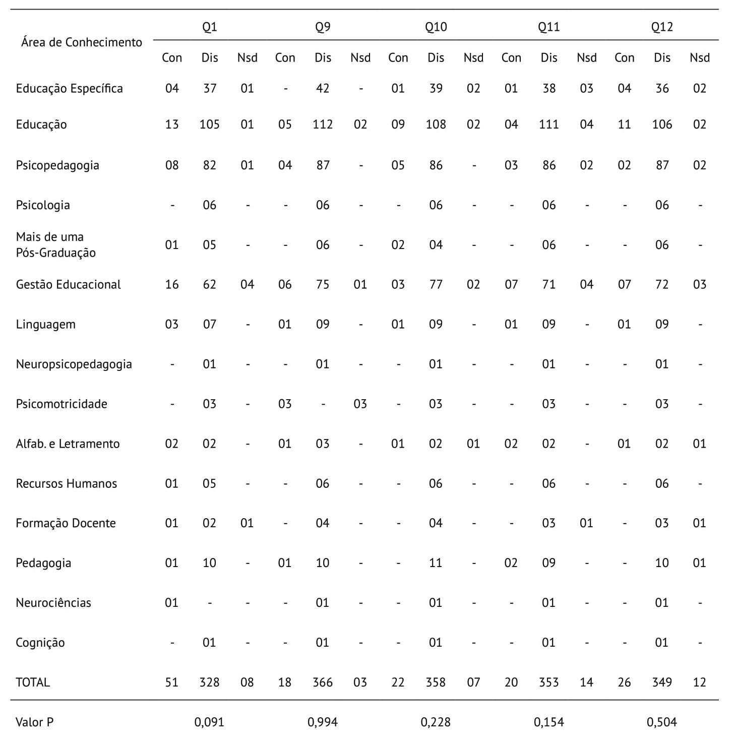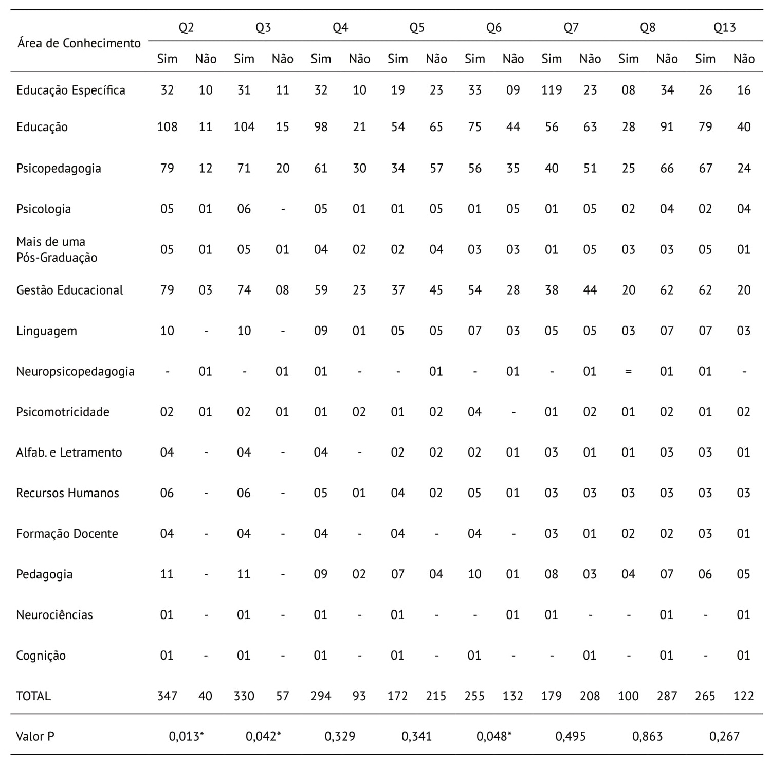 Com o objetivo de investigar se haveria influência das 15 áreas de conhecimento da formação em nível de pós-graduação das respostas dos professores às 13 questões do questionário, foi realizada uma comparação estatística por meio do teste Qui-quadrado de Pearson (Quadros 3 e 4). A análise revelou que em apenas três das 13 questões as respostas dos professores variaram de maneira significativa (p>0.05) em função da sua área de formação. Tal variação foi observada nas respostas às questões 2, 3 e 6 do questionário, como é possível observar nos Quadros 3 e 4.