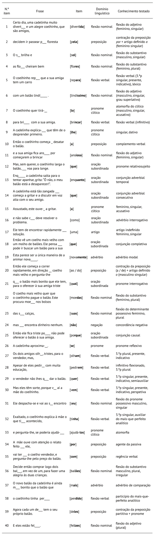 O presente teste foi desenvolvido nas quatro línguas: português, alemão, italiano, francês. Consiste numa narrativa, baseada em uma das sequências de imagens da bateria de testes Edmonton Narrative Norms Instrument (Schneider et al., 2005), que conta a história de uma cadelinha e do seu amigo coelho e o enredo em torno da perda de um balão. O texto contém 40 lacunas, que correspondem à omissão de palavras inteiras ou de apenas partes de palavras (sempre a parte final), as quais devem ser recuperadas com base no contexto narrativo. Além de avaliar o conhecimento lexical dos participantes, o preenchimento das lacunas exige, sobretudo, conhecimento morfossintático de natureza diversa, nomeadamente: i) no domínio da oração (verbos, nomes, preposições, etc.); ii) estruturas, no domínio da oração, com referência discursiva (diferentes tipos de pronomes); iii) estruturas que exprimem relações entre orações (por exemplo, conjunções, orações infinitivas, etc.). Os elementos omitidos variam quanto ao seu grau de complexidade e, consequentemente, de dificuldade de preenchimento correto. Veja-se o seguinte exemplo: