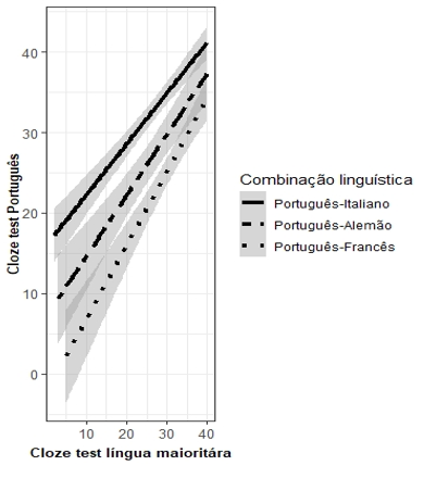 Contudo, o objetivo primordial consiste em analisar se existe uma correlação, positiva (ou negativa), entre os resultados atingidos nas duas línguas dos participantes. Para tal, corremos três testes estatísticos de associação Pearson, os quais mostram, de forma clara, que a proficiência entre as duas línguas das crianças bilingues está positivamente correlacionada (Português-Alemão: r=.68, p<.001; Português-Italiano: r=.81, p<.001; Português-Francês: r =.74, p<.001). Esta correlação é demonstrada na Figura 1.
