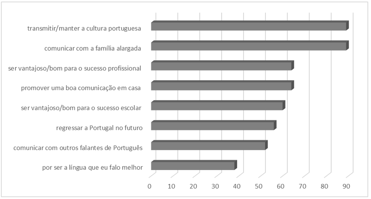 Relativamente à autoavaliação da sua proficiência, 82.5% dos pais declaram dominar a língua portuguesa como falantes nativos; os restantes afirmam conseguir “perceber conversações mais longas”. Todos os pais revelam uma atitude positiva face à manutenção do português como língua de comunicação no seio da família, considerando muito importante (79%) ou importante (21%) que os seus filhos falem português4. As principais razões apontadas são a possibilidade de conseguirem comunicar com “a família alargada (avós, tios, primos, etc.)”, assim como a “manutenção da cultura portuguesa (valores, tradições, etc.)” e as vantagens profissionais que advêm de uma competência bilingue equilibrada (veja-se a Figura 2).