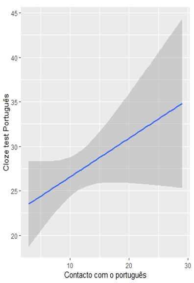Quanto à relação entre a quantidade de português falado em casa, medida pela frequência de uso do português (numa escala de 1 a 5) com cada pessoa do agregado familiar, os resultados são muito claros. Há, de facto, um efeito significativo do uso da língua sobre a proficiência linguística das crianças/adolescentes, medida através do cloze test. Quanto mais pessoas falam português no seio da família, mais elevada é a proficiência dos falantes lusodescendentes na sua língua de herança. Esta associação significativa é demonstrada na Figura 3. Concluímos, pois, que o uso do português pelos pais e irmãos de uma criança lusodescendente é um garante essencial de um desenvolvimento linguístico com sucesso e, consequentemente, da manutenção do português na diáspora.