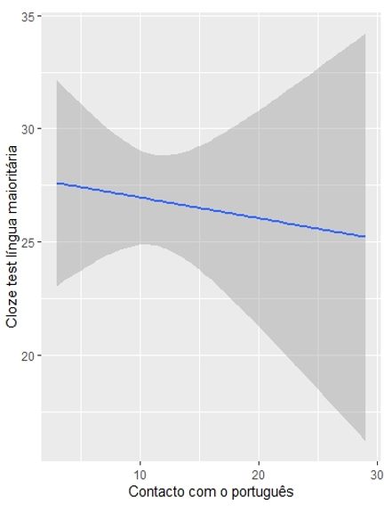 Além disso, os nossos resultados mostram uma ausência de correlação entre a quantidade de contacto com o português no seio da família e os resultados obtidos na outra língua (veja-se a Figura 4), ou seja, comprova-se que o uso da língua portuguesa no seio das famílias portuguesas não impede que as crianças lusodescendentes desenvolvam alta proficiência na língua maioritária. Como mencionado acima, o contacto que as crianças lusodescendentes têm com a língua maioritária, sobretudo na escola, nos contactos fora da família e através dos media, é suficiente para possibilitar a aquisição dessa língua.