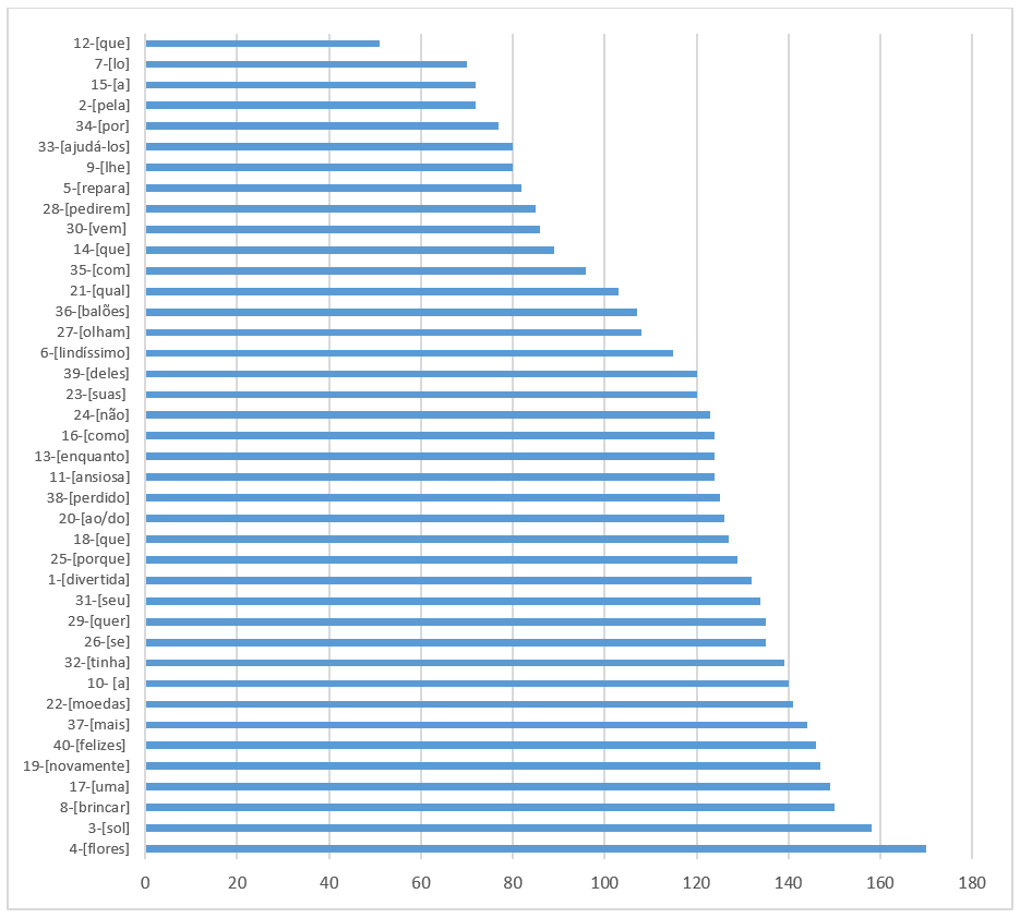 Neste caso, há lacunas que foram preenchidas pela grande maioria dos participantes, como, por exemplo, a terminação -res na frase “as flo___ cheiram bem” (item 4), que foi corretamente preenchida por 170 dos 180 participantes analisados (94.4%). Outras estruturas têm um grau de dificuldade muito elevado (mesmo para crianças monolingues), tendo as respetivas lacunas sido preenchidas por menos de metade dos participantes. Assim, as nove lacunas mais difíceis foram preenchidas corretamente por apenas 39% a 47% dos participantes. Aqui incluem-se sobretudo os pronomes clíticos (veja-se o exemplo 2, referente ao item 7) e a já referida preposição contraída com o artigo ('pela') (item 2, cf. exemplo 1).