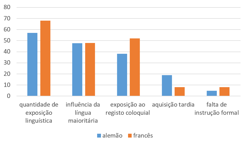 Os resultados mostram que os professores reconhecem que o processo de aquisição dos fenómenos mais complexos da língua de herança é determinado por diferentes fatores. Segundo a distribuição das respostas obtidas, o fator mais importante é a quantidade de exposição linguística, seguido pela influência da língua maioritária e a exposição ao registo coloquial da língua. O facto de a quantidade do input linguístico ser considerada ainda mais relevante pelos professores dos cantões franceses é indicativo da perceção da importância do uso do português no seio familiar, sobretudo nos cantões franceses onde a tendência para o abandono do uso da LH em casa é mais acentuada.