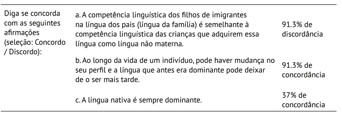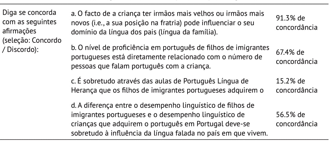 No entanto, 91.3% dos professores rejeitam a ideia de que a competência linguística das crianças lusodescendentes seja semelhante à competência das crianças que adquirem o português como uma segunda língua. Além disso, também 91.3% dos professores admitem que a dominância linguística pode mudar ao longo da vida. Este resultado mostra que os professores têm consciência de que pode haver mudança no perfil linguístico de um falante de herança. Porém, a taxa bastante alta de aceitação da afirmação c. mostra que nem todos os professores consideram a mudança da dominância linguística um fenómeno muito comum.