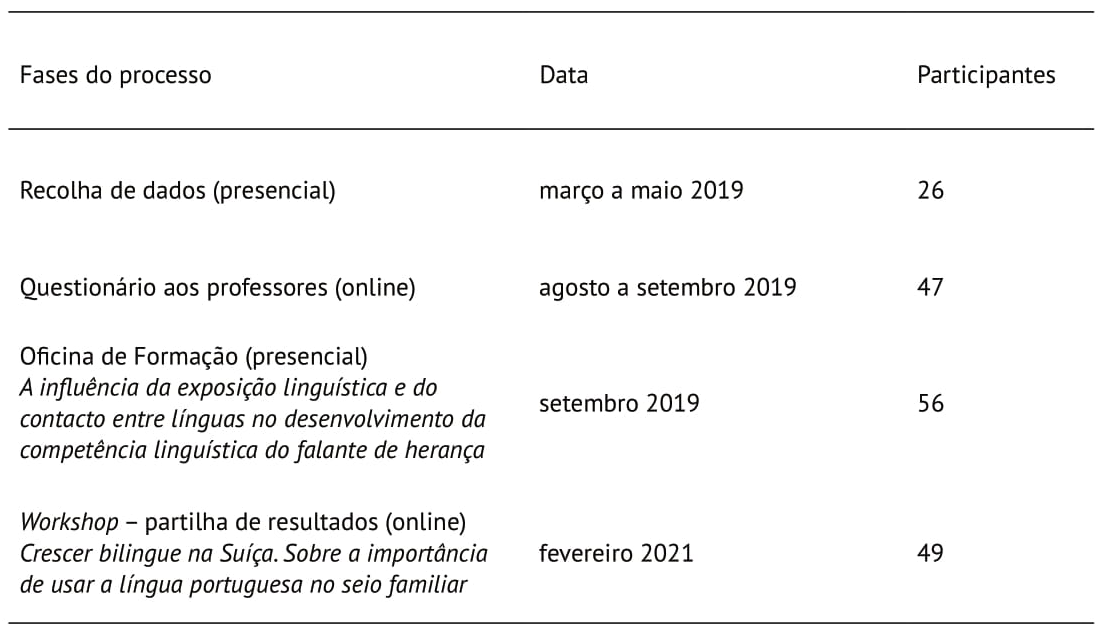 Para compreender quais as consequências didáticas que os professores tiram do estudo para as suas aulas foi dinamizado um workshop pela equipa de investigação intitulado “Crescer bilingue na Suíça. Sobre a importância de usar a língua portuguesa no seio familiar”, com o objetivo de partilhar os resultados da investigação empírica acima descrita, bem como de refletir sobre os mesmos. Em particular, pretendeu-se refletir sobre a forma como estes resultados poderão contribuir para fomentar a qualidade do ensino de PLH, no que diz respeito a estruturas linguísticas complexas, geralmente não usadas em ambientes familiares e/ou informais.