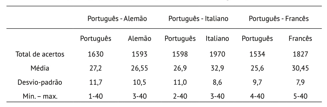 Quais são os resultados globais atingidos nas várias línguas? Existe uma correlação, positiva ou negativa, entre os resultados atingidos nas duas línguas dos participantes?