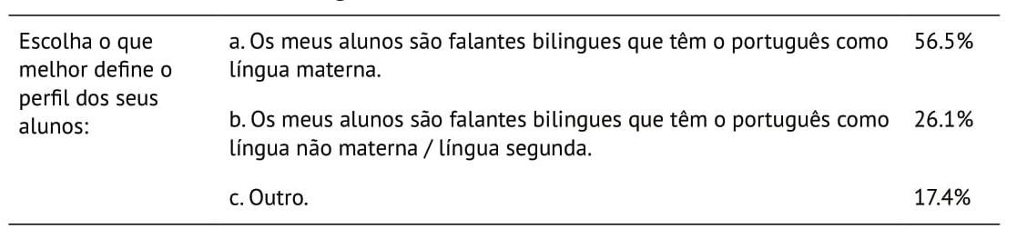 Verifica-se que 56.5% dos professores classificaram os alunos como falantes nativos do português e 26.1% classificaram-nos como falantes não nativos. Dos professores que escolheram dar a sua própria classificação, um professor (2.2%) declarou que os alunos não são falantes bilingues, 8.7% classificaram os seus alunos como falantes do português língua de herança e 6.5% indicaram que as duas possibilidades existem (falantes nativos e não nativos). Apesar de alguns dos alunos pertencerem já à terceira geração de imigração portuguesa na Suíça, podendo, de facto, ser falantes não nativos, os resultados mostram que a maioria dos professores, mas não todos, reconhece que os seus alunos são falantes nativos do português.