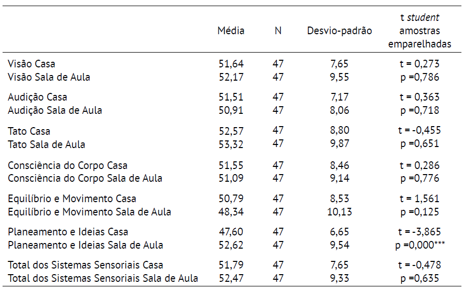 No que diz respeito ao segundo objetivo do estudo - Comparar o processamento sensorial das crianças nos dois contextos (sala de aula vs. casa) -, verificou-se que a maioria das crianças não apresenta diferenças na quantidade de problemas nos dois contextos. Através da Tabela 1 observou-se a existência de diferenças significativas na dimensão do “Planeamento e Ideias”, que se remete à práxis, nos dois contextos. Esta desigualdade é suportada por Parham (2002), referindo que os problemas “não reconhecidos” se tornam evidentes quando a criança entra para a escola, onde existe maior diversidade de tarefas e um aumento no grau de exigência. Também neste contexto, as crianças podem ter de realizar atividades que antes evitavam, ou de que não necessitavam, como por exemplo a escrita, os trabalhos manuais (que exigem recortar, desenhar e colar), e ainda as atividades de educação física, onde as crianças com dificuldades na práxis geralmente apresentam problemas. Efetivamente, as dificuldades em conseguir cumprir as tarefas exigidas podem ocasionar um declínio nas notas escolares, motivação e autoestima (Clark et al., 2019; Parham, 2002). As crianças com dificuldades na práxis necessitam de maior apoio comparativamente com os pares, porém, os pais tendem a não valorizar esses aspetos, associando-os a características individuais das mesmas (Reeves & Cermak, 2002).