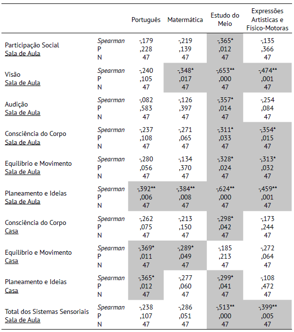 Uma das áreas que se destacou da SPM - Forma Sala de Aula, revelando correlações significativas negativas com o desempenho escolar, foi o “Planeamento e Ideias”, que se relaciona com todas as disciplinas, salientando-se a relação com Expressões Artísticas e Físico-Motoras (RSpearman = -0,459, p = 0,001) e com Estudo do Meio (RSpearman = -0,624, p = 0,000). Também a “Consciência do Corpo” e o “Equilíbrio e Movimento”, que se relacionam com Estudo do Meio e Expressões Artísticas e Físico-Motoras. E ainda o “Total dos Sistemas Sensoriais”, que apresenta igualmente uma correlação significativa com Estudo do Meio (RSpearman = -0,513, p = 0,000) e com Expressões Artísticas e Físico-Motoras (RSpearman = -0,399, p = 0,005). A “Visão” correlaciona-se com Matemática (RSpearman = -0,348, p = 0,017), Estudo do Meio (RSpearman = -0,653, p = 0,000) e Expressões Artísticas e Físico-Motoras (RSpearman = -0,474, p = 0,001). Por último, a “Audição” e a “Participação social” correlacionam-se com Estudo do Meio.