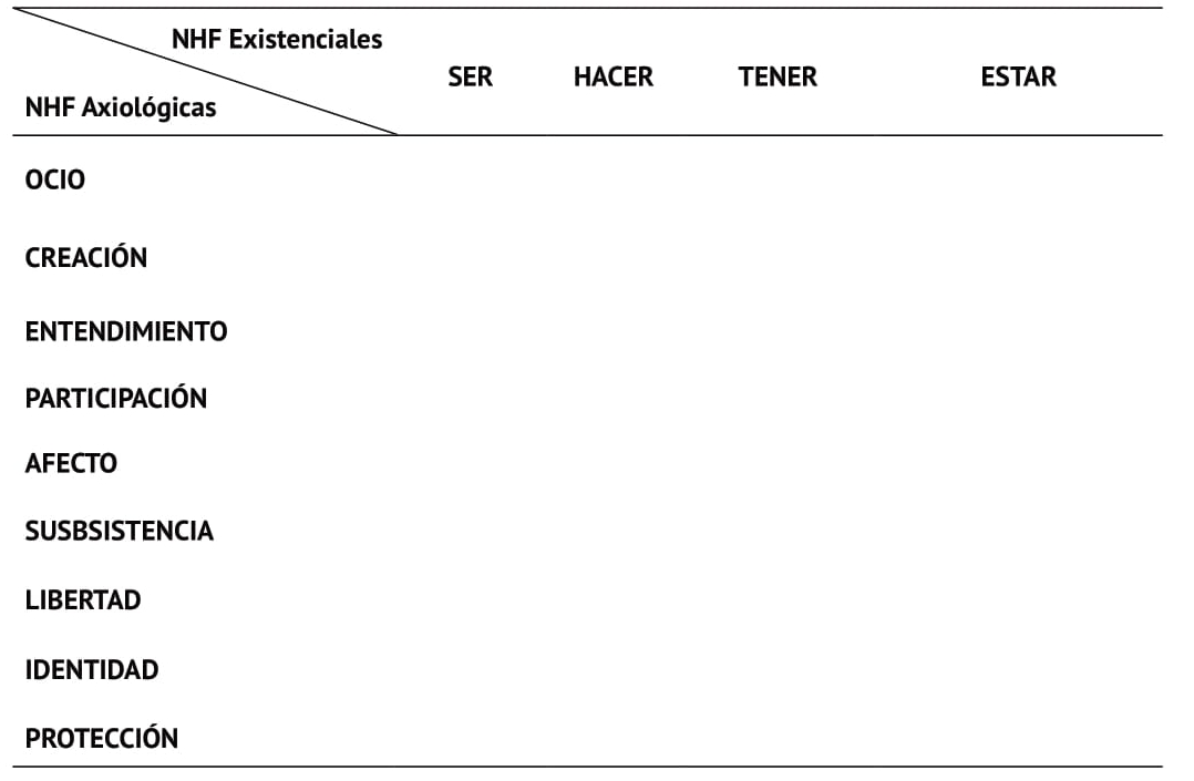 Desde esta perspectiva, las necesidades humanas fundamentales (NHF) son finitas, clasificables y universales. Esto se expresa a través la organización de las necesidades en una categoría “existencial”, que incluye las necesidades del Ser, Tener, Hacer y Estar; y otra categoría “axiológica” que comprende las necesidades de Libertad, Protección, Afecto, Entendimiento, Subsistencia, Participación, Ocio, Creación e Identidad (Max-Neef, et al., 1994; Henríquez & Pacheco, 2014; Gómez & Ibarra, 2020).