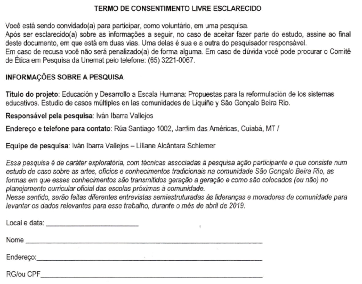 En el marco del estudio del caso, cabe señalar que la etapa de recolección de datos se dio durante los meses de abril, mayo y junio de 2019 y en ella se tuvo por objetivos: a) diagnosticar artes, oficios, saberes y conocimientos tradicionales cuiabanos presentes en la comunidad; b) identificar y analizar las formas de transmisión intra e intergeneracional de estos conocimientos; c) identificar y analizar el tratamiento (o no) que las escuelas dan a las artes, oficios y saberes locales cuiabanos.