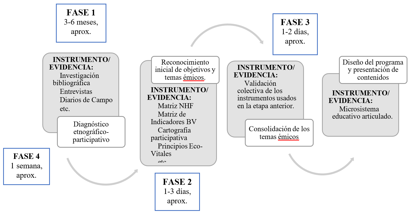 Así como los temas émicos quedan, a priori, establecidos entre estas dos fases, los objetivos que los grupos persiguen con la creación pedagógica también deben ser claramente definidos. Esto es de suma importancia. Si se considera la educación como un instrumento, como herramienta y no como un fin en sí mismo, entonces deben ser correctamente formulados los objetivos que se persiguen con su uso. En la tercera fase se comunican los resultados de la codificación, consolidación y sistematización que permiten avanzar hacia el proceso de deconstrucción y rediseño, en el que se definen fundamentos éticos y morales y, también, los temas émicos, artes, oficios o saberes que serán transmitidos. La cuarta fase, y final, consiste en el diseño del programa y presentación de los contenidos surgidos de las fases anteriores. Además, se sugiere la existencia de una quinta fase, no declarada en la figura 3, que contemple el monitoreo y acompañamiento de las acciones diseñadas.