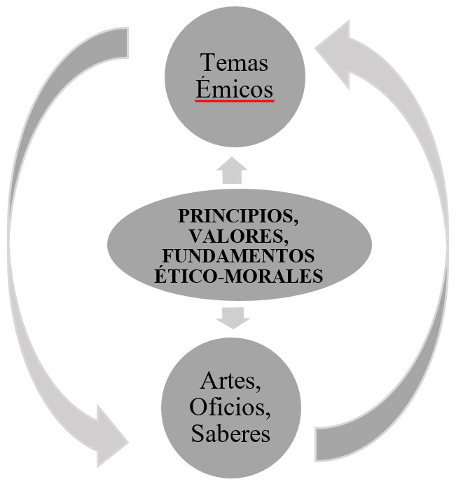 Las categorías “Artes, Oficios y Saberes” y “Temas Émicos” se deducen de estos principios que, si bien en el esquema se representan de manera separada, lo cierto es que comparten un vínculo indisoluble, ya que deben retroalimentarse permanentemente. Así, se desprende que lo ideal es que no se reduzcan a una escisión espacio-temporal, sino que formen parte de un flujo sinérgico constante de estímulos teóricos y prácticos.