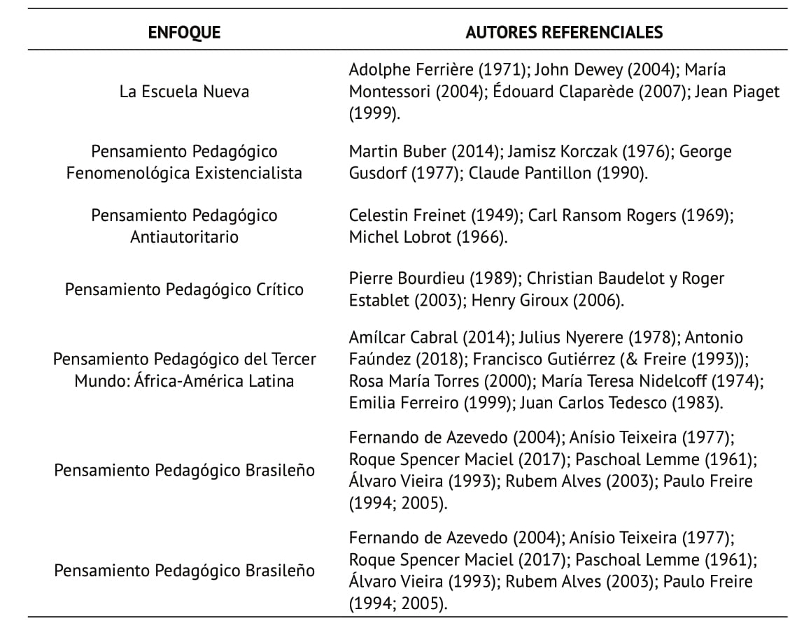 Esta matriz, sólo en apariencia es rígida, ya que es posible encontrar convergencias entre las perspectivas de los autores que forman parte de esta clasificación. Por ejemplo, la teoría de reproducción social de Bourdieu (1989) se encuentra fuertemente presente en las contribuciones de Tedesco (1983). De la misma manera, los aportes de La Escuela Nueva son fundamentales para comprender las propuestas de Freire (1994; 2005).