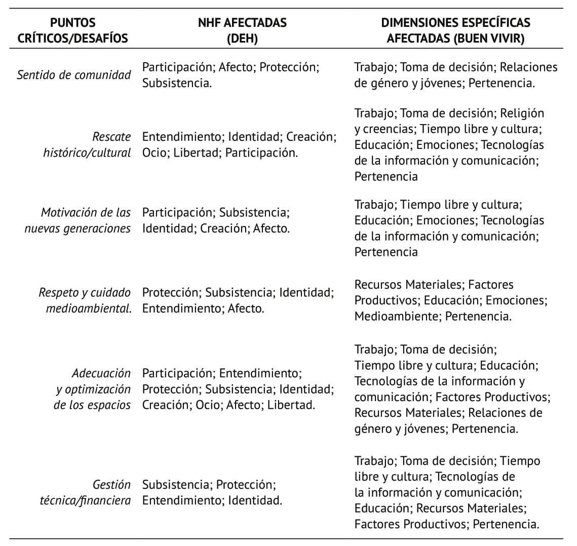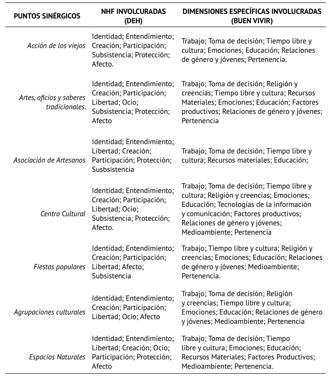 Por otra parte, también fue posible verificar la presencia de puntos sinérgicos (Tabla 3), elementos que, dado su alcance y desarrollo, son capaces de estimular simultáneamente a múltiples NHF y dimensiones específicas de Buen Vivir.