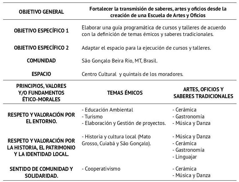 Considerando los puntos críticos y sinérgicos surgidos a partir de la observación en campo, las entrevistas y la aplicación de la Matriz NHF, fue posible proponer como objetivo el fortalecimiento de la transmisión de conocimientos, saberes, artes y oficios en la comunidad de São Gonçalo Beira Rio, a través de la creación de una Escuela de Artes y Oficios.