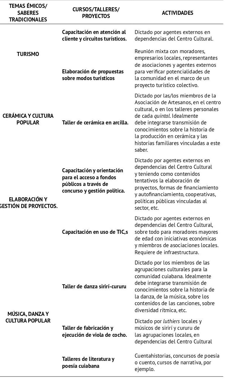Se torna fundamental crear propuestas atractivas que llamen la atención de las nuevas generaciones, que las inviten a preservar, crear y difundir su cultura y, para esto, es vital una mayor articulación entre los miembros estratégicos de la comunidad vinculados al turismo y la cultura, además de contar con el apoyo de escuelas, académicos y/o profesionales con conocimiento técnico en elaboración de proyectos y autoridades políticas realmente comprometidas con el desarrollo y promoción de la cultura cuiabana, ya que de lo contrario el riesgo de extinción de la artesanía en arcilla es inminente.