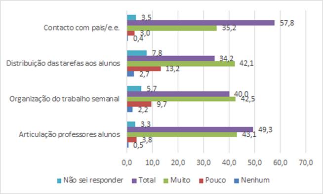 Alguns professores consideram que os alunos que necessitam de mais apoio são os que têm famílias disfuncionais, que não colaboram no ensino a distância, por isso, foi necessário “dar mais apoio aos alunos e às famílias”, “deparei-me com a realidade que os alunos que necessitam de mais apoio são os que têm famílias mais disfuncionais, que não colaboram” e este aspeto é mais relevante ainda nas faixas etárias mais baixas em que “o contacto com os alunos, devido à idade, é feito maioritariamente através dos pais”; “ tenho despendido imenso tempo com os pais, de modo a poderem acompanhar os educandos, têm sido tiradas dúvidas a pais e alunos”. Os professores assumiram, ainda, um papel de maior controlo sobre os alunos: “como não é possível acompanhar o trabalho real dos alunos, nas aulas síncronas temos de redobrar a nossa atenção e fazer questões direcionadas com o objetivo de verificar o trabalho dos alunos, cujos trabalhos entregues não correspondem ao trabalho a que nos habituamos na sala de aula”.
