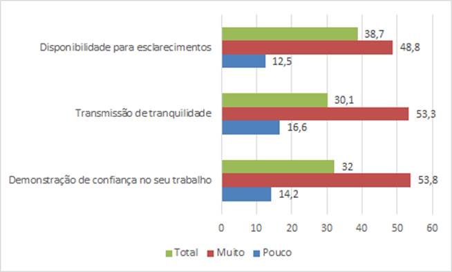 No que concerne aos coordenadores de departamento (Figura 2), o grau de apoio foi genericamente elevado, dominando as opções “total” e “muito”, com somatórios superiores a 80,0%, nos três aspetos considerados: demonstração de confiança, transmissão de tranquilidade e disponibilidade para esclarecimentos. Em termos relativos, segundo os respondentes, o apoio foi mais relevante no que respeita à disponibilidade para esclarecimentos.