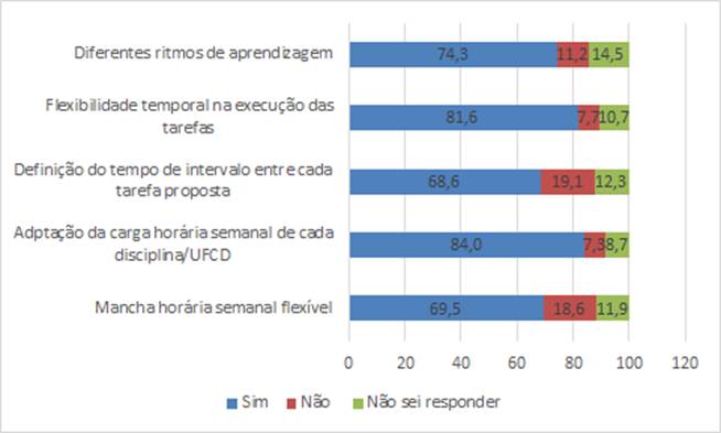 Relativamente à conceção dos horários dos alunos (ver Figura 3), segundo a maioria dos respondentes (entre 68,6% a 84,0%), os estabelecimentos de ensino seguiram as orientações do Roteiro nos diferentes aspetos: mancha horária semanal flexível, adaptação da carga horária semanal, definição do tempo de intervalo entre cada tarefa proposta, flexibilidade temporal na execução das tarefas e diferentes ritmos de aprendizagem. De qualquer modo, a conformidade é mais acentuada na flexibilidade temporal na execução das tarefas e na adaptação da carga horária semanal do que na definição do tempo e de intervalo entre cada tarefa e a mancha horária semanal flexível.