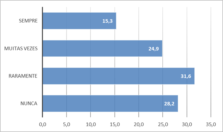 Passando ao #EstudoEmCasa, os resultados obtidos mostram que os participantes se dividem em relação à frequência do uso deste recurso para apoiar o ensino e aprendizagem, embora com uma tendência mais acentuada para as opções “raramente” (31,6%) e “nunca” (28,2%), as quais, em conjunto, perfazem quase 60,0% das respostas dadas. Repare-se que apenas 15,3% admitem recorrer “sempre” e 24,9% “muitas vezes”.