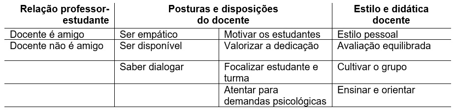 A Tabela 1 apresenta os resultados com as categorias, por tema: relação professor-estudante, posturas e disposições do docente, e estilo e didática docente.