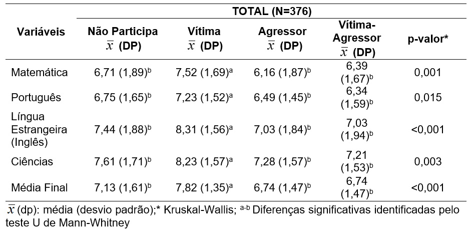 Quando analisados todos os participantes, verificaram-se diferenças significativas no desempenho escolar entre os papéis de participação no bullying em todas as disciplinas analisadas, bem como na média final. De acordo com os achados deste estudo, as vítimas apresentaram melhores resultados em todas as disciplinas quando comparadas aos outros papéis de participação no bullying (p=0,001; p=0,015; p<0,001; p=0,003; p<0,001) (Tabela 1).