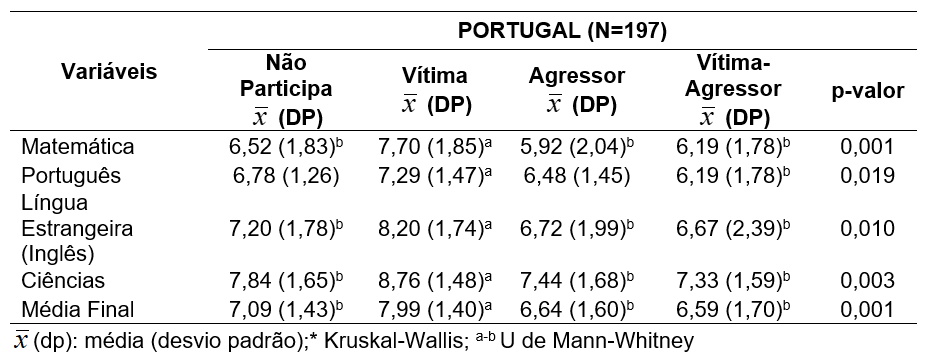 Ao analisar separadamente os participantes de Portugal, também foram encontradas diferenças significativas entre os papéis de participação no bullying em todas as médias analisadas. De acordo com os resultados, em português, as vítimas apresentaram melhor desempenho que os agressores e vítimas-agressoras (p=0,019). Já em matemática, língua estrangeira (inglês), ciências e média final, as vítimas apresentaram melhores resultados, tanto em relação aos agressores e vítimas-agressoras, quanto em relação aos que não participam do bullying (p=0,001; p=0,010; p=0,003; p=0,001, respetivamente) (Tabela 2).