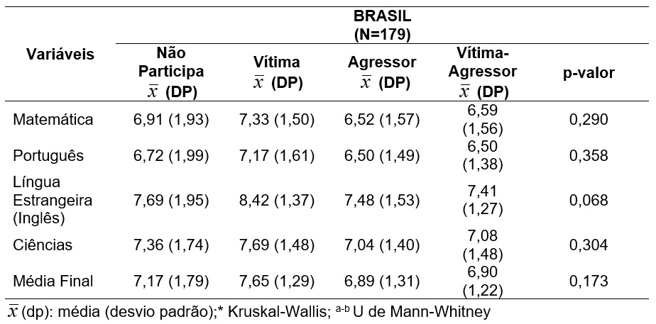 Por fim, quando analisados os participantes brasileiros, não foram encontradas diferenças significativas entre o desempenho escolar e os papéis de participação no bullying (Tabela 3).