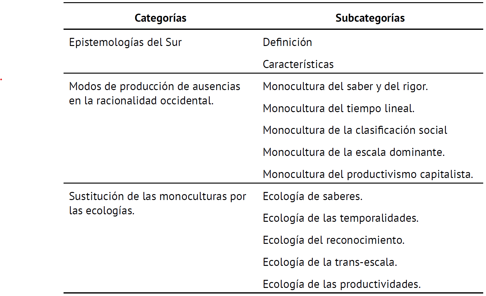 La investigación se desarrolla bajo un enfoque cualitativo, ya que “se enfoca en comprender los fenómenos, (…) en un ambiente natural” (Hernández et al., 2018, p. 59), en este sentido, el alcance es exploratorio y descriptivo. En primera instancia, se organiza categorías para el análisis bibliográfico (Tabla 1), teniendo como eje central las obras de Boaventura de Sousa Santos, debido a que él es el principal exponente de las Epistemologías del Sur. El análisis de la literatura especializada se realizó con el software de análisis cualitativo Atlas ti 8.0.