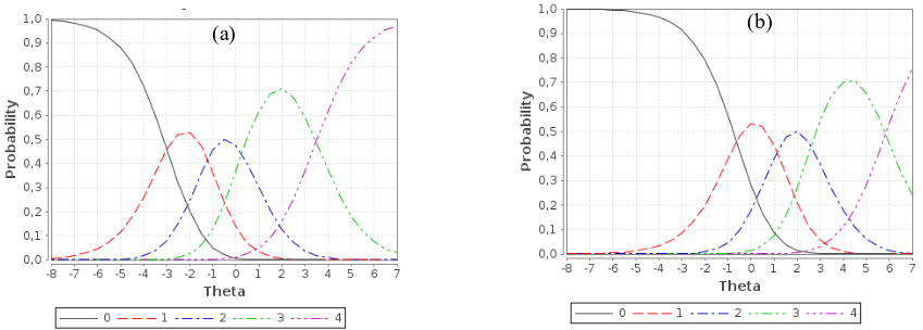 A análise dos limiares de categoria foi realizada apenas à parte 2 do QALA visto ser a única parte que é composta por itens politómicos (escala do tipo Likert). Pela análise às Curvas Características dos Itens que compõem a Parte 2 do QALA (ver exemplos das figuras 1a e 1b), verifica-se que as probabilidades de resposta dos vários itens estão organizadas em ordem ascendente e concordante com as categorias definidas. Tal facto indica que as 5 categorias de resposta definidas (Discordo Totalmente (0), Discordo (1), Não Concordo Nem Discordo (2), Concordo (3) e Concordo Totalmente (4)) estão bem ajustadas, não havendo qualquer tipo de desordem nem necessidade de reclassificação.