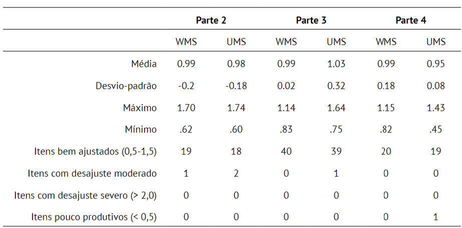 Para um modelo bem ajustado, os valores de WMS e UMS deverão estar enquadrados no intervalo entre 0,5 e 1,5 que, segundo Linacre (2002), são valores produtivos para a medida. Já itens com valores de WMS e UMS acima de 2,0 deverão ser retirados sob pena de haver distorção e degradação das medidas (Linacre, 2002; Cadime et. al, 2017).