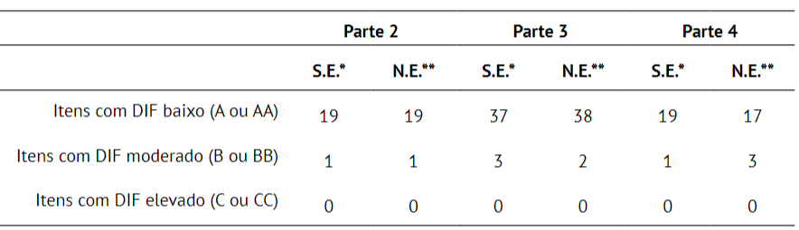 Para a verificação da existência de itens com DIF recorremos ao método Cochram-Mantel-Haenszel que classifica os itens quanto ao grau de DIF. Utilizaram-se como subgrupos em análise o subsistema de ensino e o nível de ensino dos professores. Desta forma, verificou-se se os itens tinham um funcionamento semelhante entre professores do subsistema Público e Particular/Cooperativo, bem como entre os professores do 3.° Ciclo e Secundário e os professores do 1.° e 2.° Ciclos.